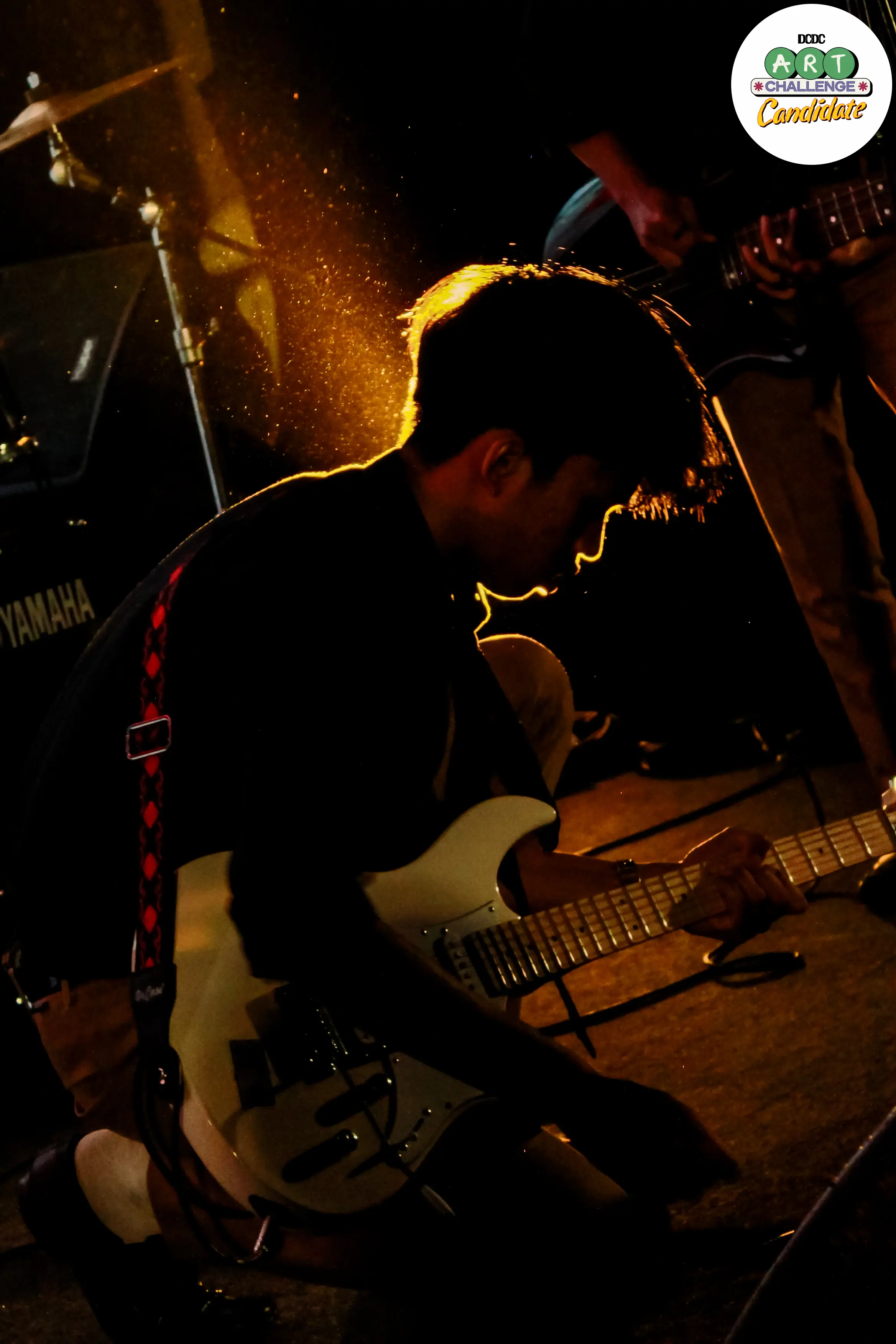 Object: Gitaris TheBandturan yang sedang memainkan nada nya dengan efek glory dari back light dengan moment yang pas menjadikannya seperti sesosok misterius dengan aura keemasan