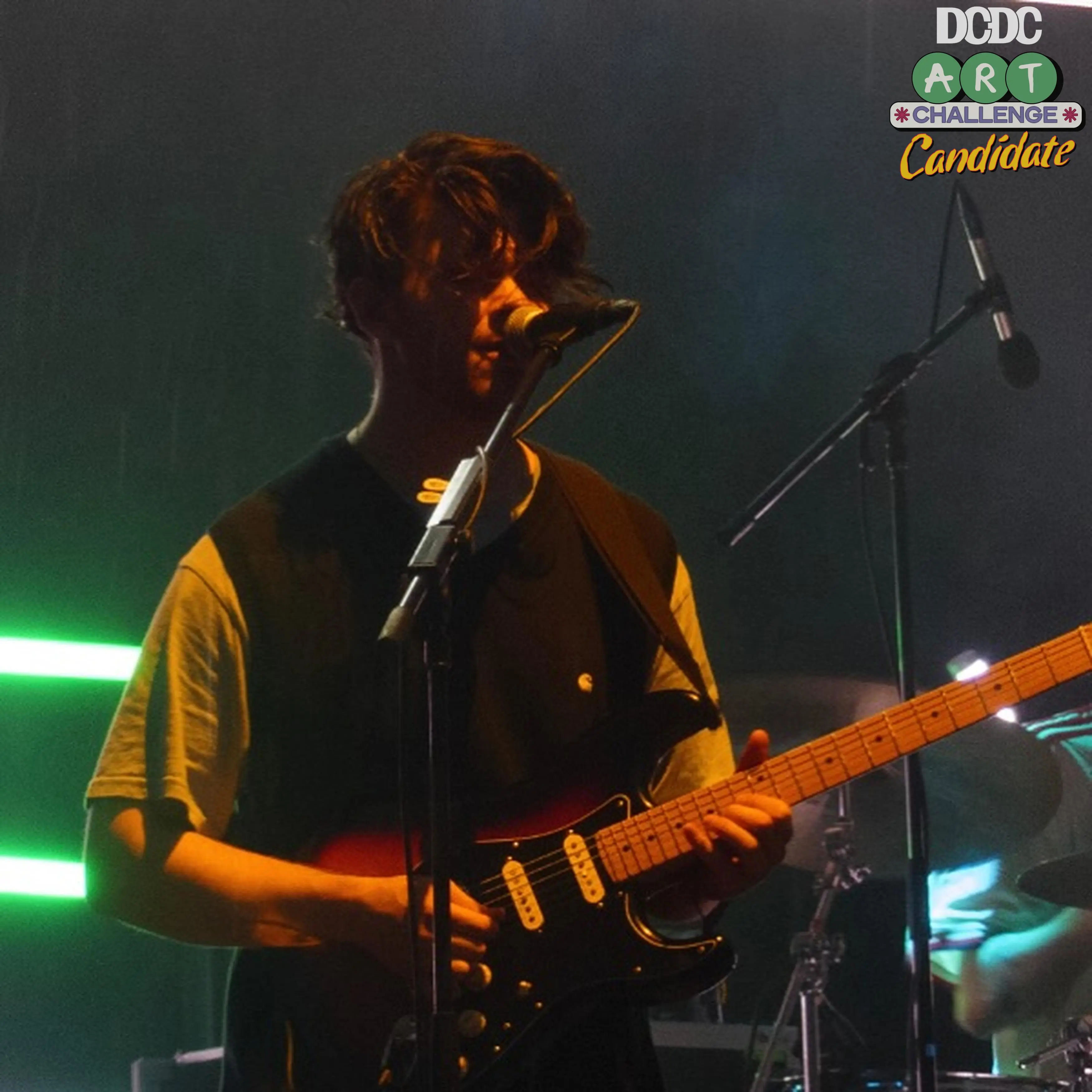 Foto ini menampilkan seorang gitaris yang sedang tampil di atas panggung dengan pencahayaan dramatis. Sinar hijau neon dan suasana gelap di sekitarnya menonjolkan ekspresi fokus sang musisi yang tengah larut dalam alunan musik. Dengan gitar elektrik di tangan dan mikrofon di depannya, momen ini menangkap keintiman dan intensitas sebuah penampilan live yang penuh emosi dan dedikasi terhadap musik.