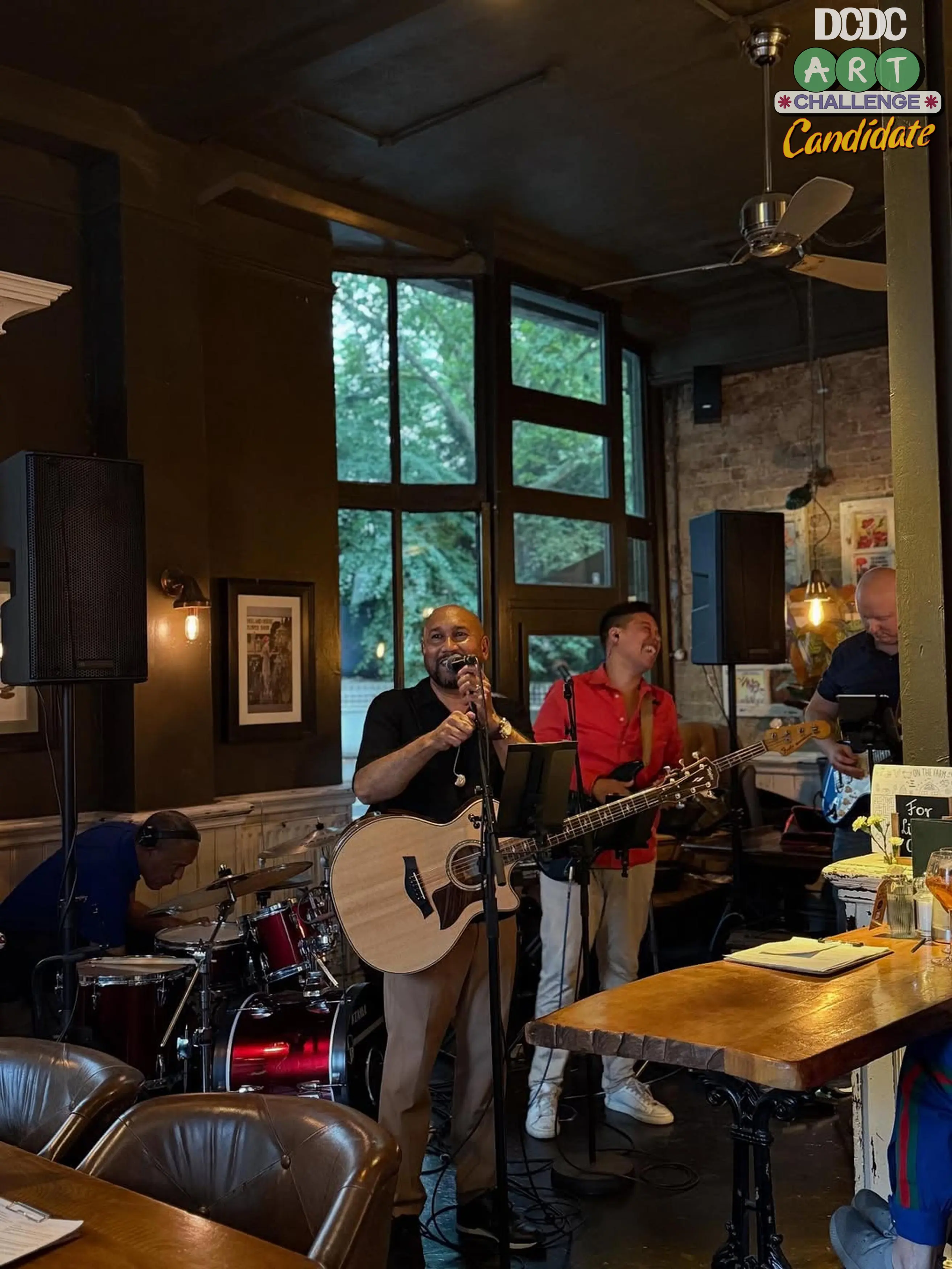 Foto ini menampilkan momen hangat sebuah band yang sedang tampil di dalam kafe dengan nuansa klasik dan pencahayaan lembut. Interior kafe dengan dinding bata dan jendela besar memberikan kesan intim dan akrab, menciptakan pengalaman musik live yang penuh kehangatan dan kebersamaan.