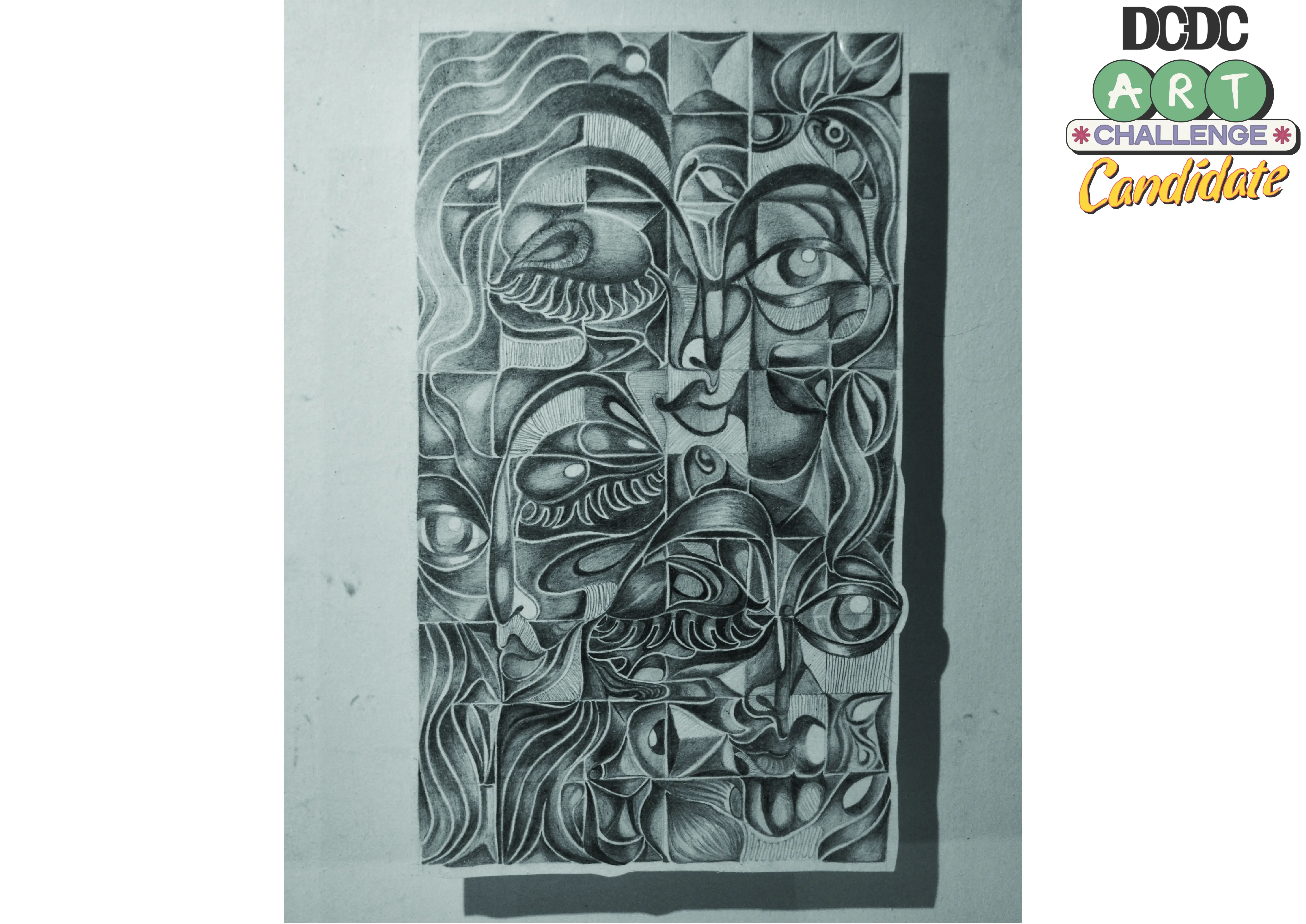 Karya ini, pada pandangan pertama, tampak sebagai permainan bentuk—wajah-wajah terpecah, berlapis, saling menatap dalam pusaran ruang geometris. Namun di balik struktur visualnya, tersimpan percakapan purba tentang jati diri dan keseimbangan kosmos. Judulnya sendiri, “Aing Inya Éta,” sebuah ungkapan Sunda yang menggoda dan reflektif, meminjam kelakar untuk menyingkap lapisan filsafat yang dalam. Ia menggemakan kesadaran Sunda Buhun, di mana manusia bukan pusat, melainkan bagian dari tatanan semesta. Dalam kebudayaan Kabuyutan dan Sunda Wiwitan, diri tidak berdiri sendiri—ia adalah pantulan dari jagat gede (makrokosmos) yang memancar dalam jagat leutik (mikrokosmos). Maka, serpihan wajah-wajah dalam karya ini bukan sekadar fragmentasi modern, melainkan simbol dari kesadaran bahwa manusia sejatinya terdiri dari banyak jiwa, banyak bayangan, dan banyak waktu.