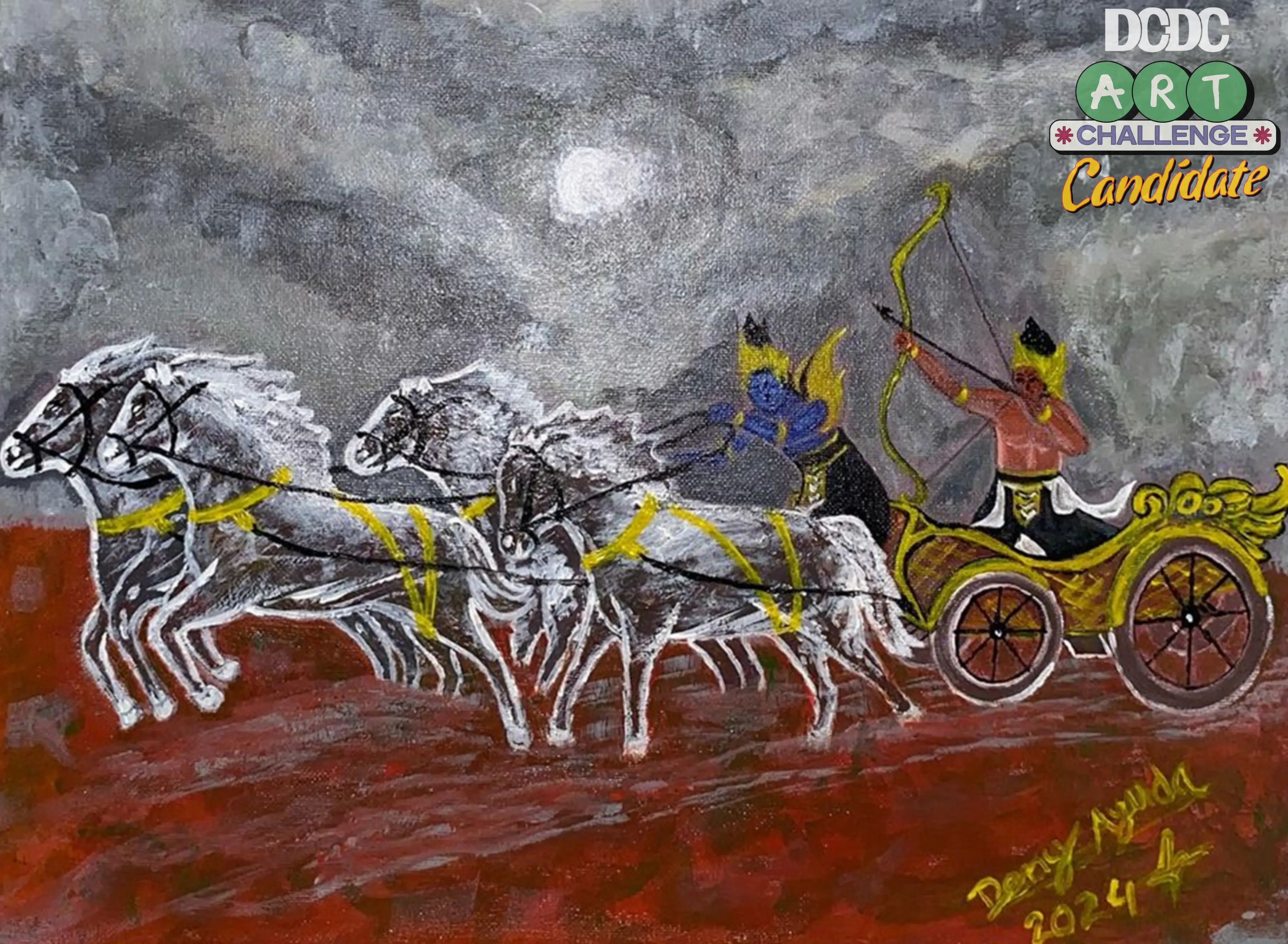 Lukisan ini memberikan kesan adegan epik atau mitologis. Komposisi yang dinamis dan penggunaan warna yang dramatis berhasil menciptakan suasana yang tegang dan penuh aksi. Kereta kuda dan penunggangnya tampak siap menghadapi tantangan atau pertempuran. cat akrilik diatas kanvas, 30 x 40 cm.