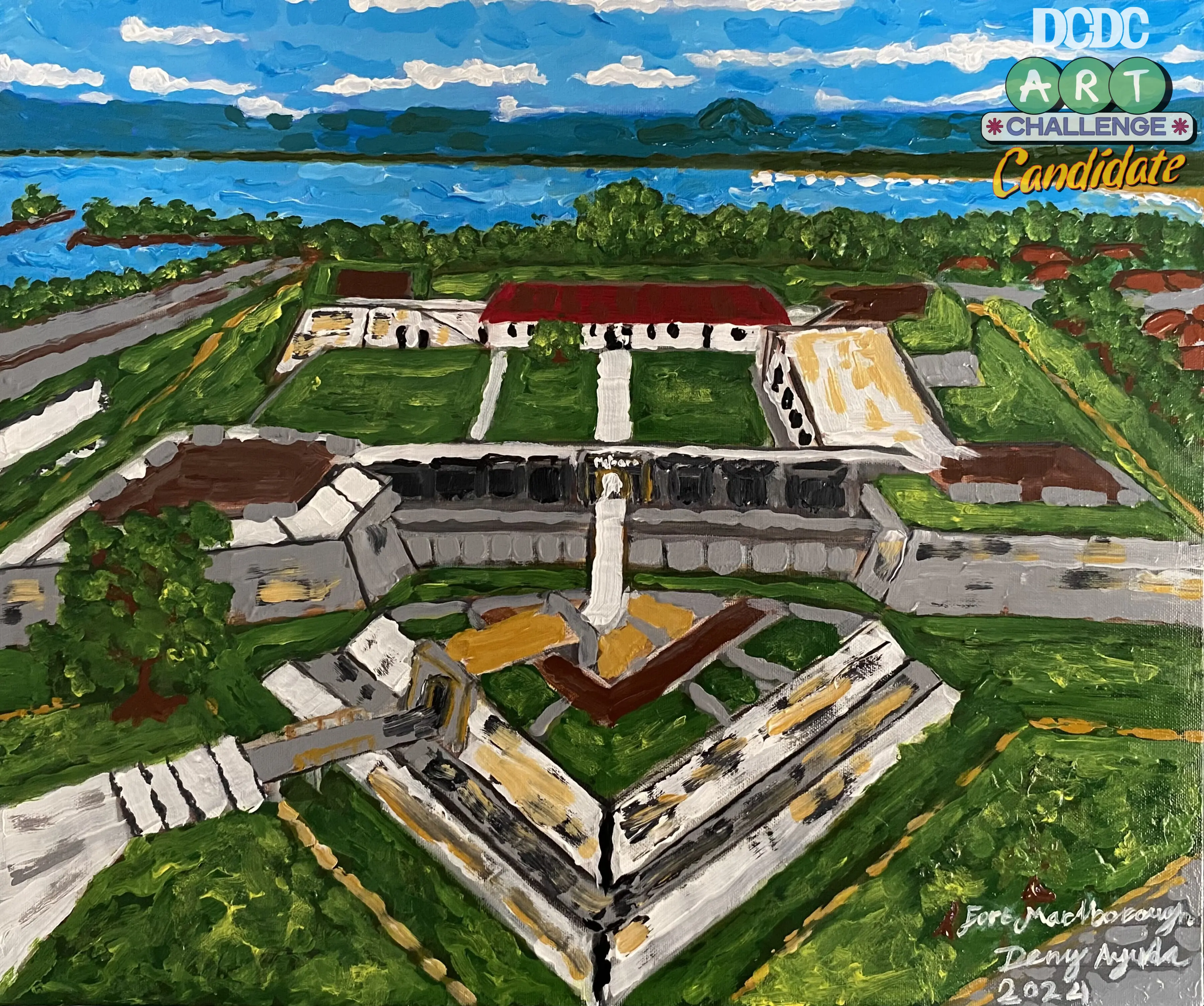 Lukisan ini menggambarkan sebuah bangunan bersejarah yang memiliki nilai penting bagi masyarakat Bengkulu. Warna-warni dan Bangunan benteng yang kokoh dilukisan ini, Mengreprestasikan beragam-ragam perbedaan budaya dibengkulu yang saling hidup damai berdampingan. cat akrilik diatas kanvas, 50 x 60 cm.