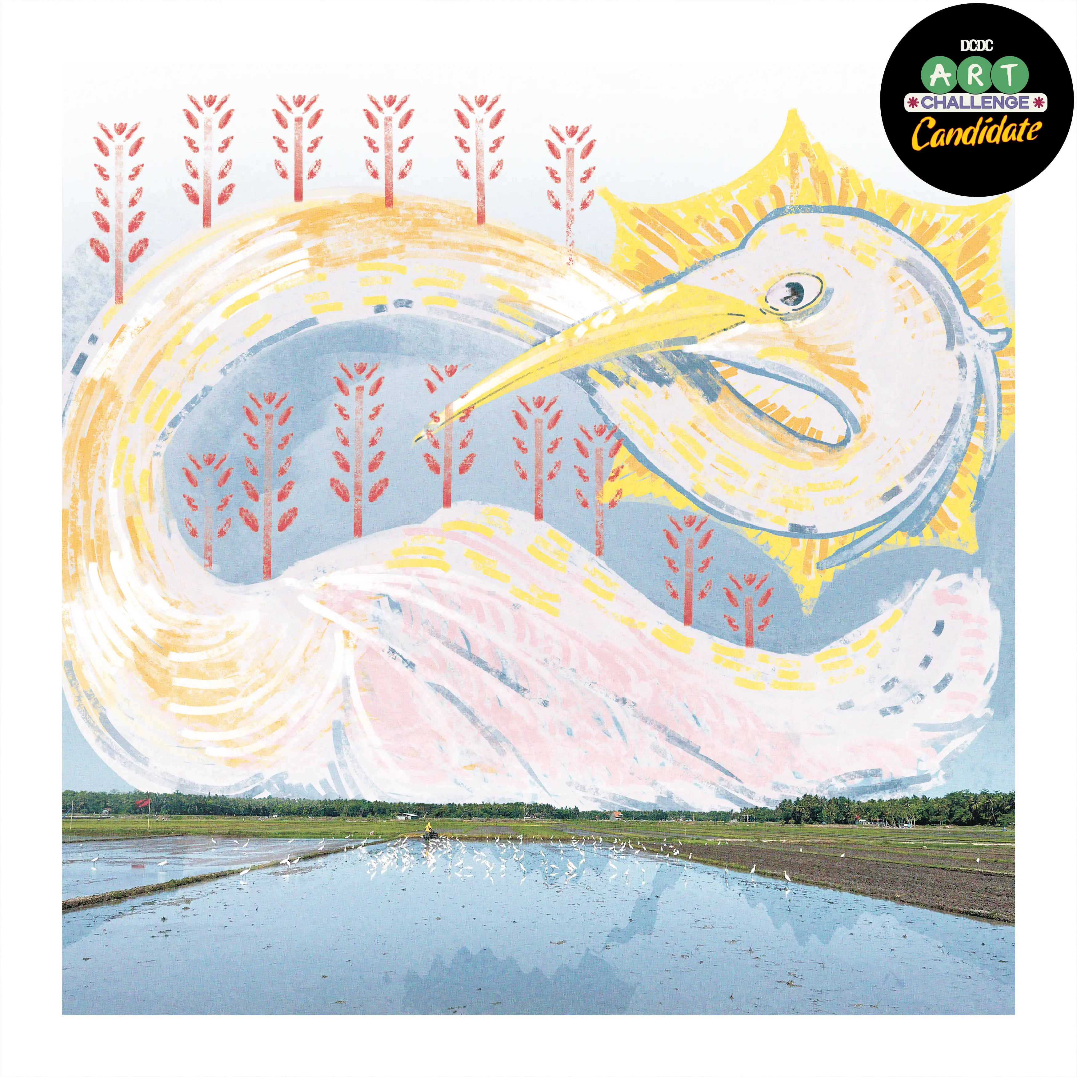 Burung Kuntul saling berterbangan, menyambar, menyilang di udara mengikuti satu sama lain dan sampailah pada persinggahan tanah subur itu. Burung Kuntul kehilangan teman Kerbau. Burung Kuntul tetap setia menunggu di ladang. Kerbau sudah kehilangan tanduknya, detak jantungnya sudah menjadi mesin beroda, dan kulit kerasnya berupa baja berlapis karbon. Kayaknya Burung Kuntul menganggap mesin itu adalah Kerbau yang kemarinkemarin. Ketika Mesin membajak sawah dan Burung Kuntul merayap mengikuti dibelakangnya, ketika itu juga serangga keluar dan HAP! Lalu di makan! Petani tidak pernah sendirian di tengah sawah jauh mata memandang. ah mesra sekali!