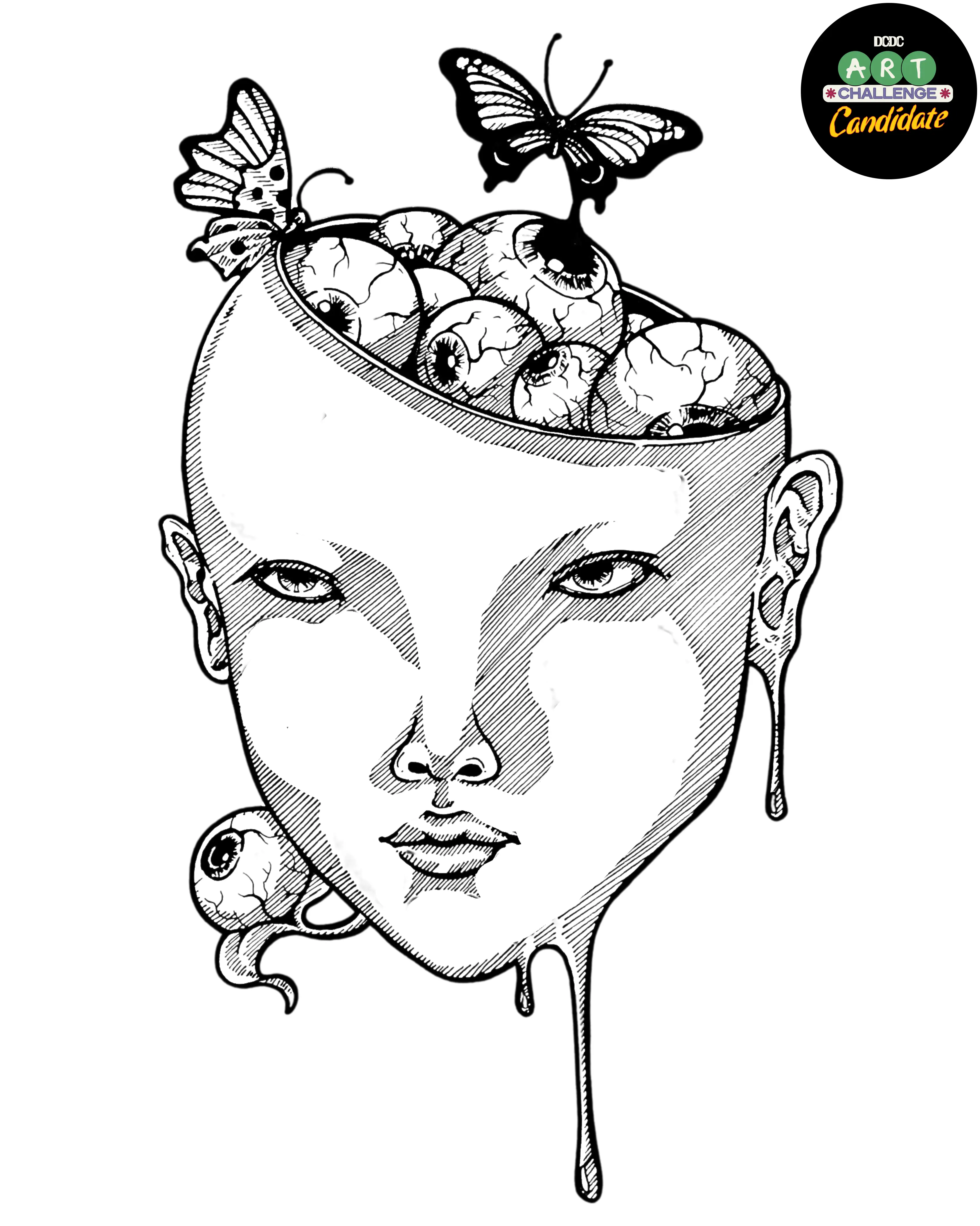 Karya ini memperlihatkan sebuah wajah manusia yang bagian atas kepalanya terbuka, dipenuhi mata-mata yang berdesakan seolah lahir dari pikiran. Dari kumpulan mata itu, kupu-kupu muncul, terbang ringan meninggalkan kerumunan pandangan yang stagnan. Judul “Eyes Without Horizon” menyingkap paradoks tentang penglihatan yang tidak pernah menemukan batas, pandangan yang tak berujung, namun justru kehilangan arah.