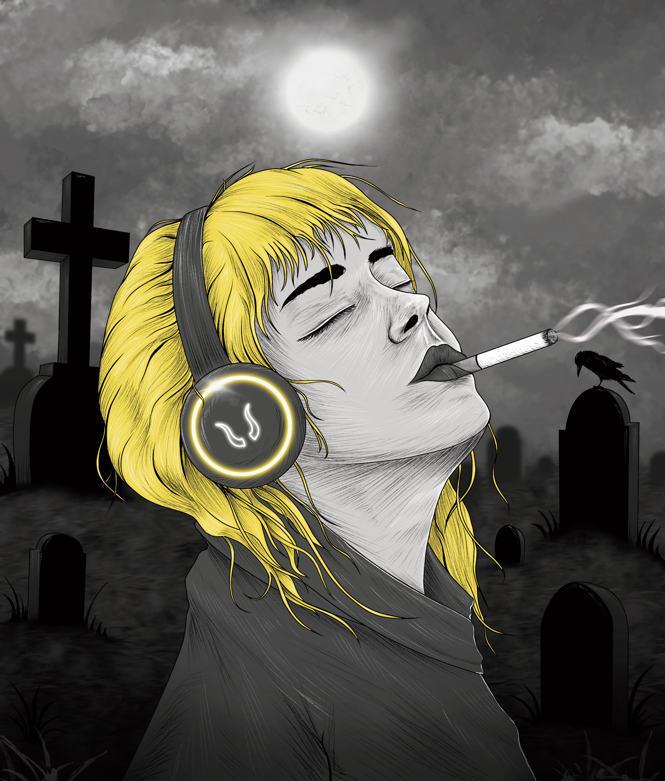 Nisan membisu menjadi saksi sunyi atas kehadiran sosok ini. Seekor gagak yang bertengger di atasnya menjadi simbol klasik dari kematian dan pertanda akhir. Kontras visual antara rambut kuning terang dan dunia kelam di sekitarnya menegaskan bahwa dalam singkatnya hidup, masih ada intensitas, kenikmatan, dan keberanian untuk memilih cara menghadapi akhir.
