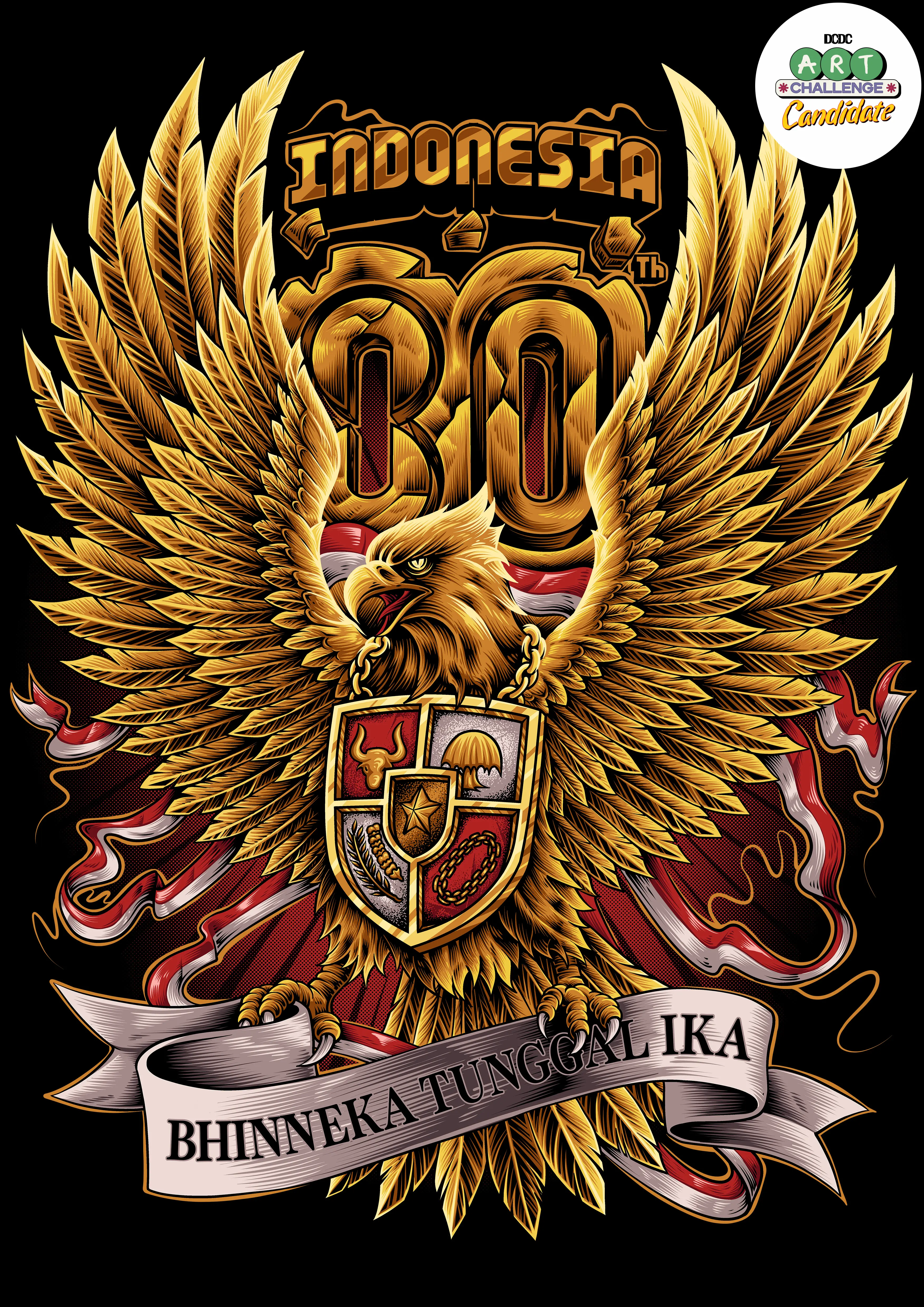Karya yang menampilkan Burung Garuda berwarna emas keagungan, yang mencengkeram pita bertuliskan "Bhinneka Tunggal Ika" melambangkan persatuan dalam keragaman, dengan perisai di dadanya yang memuat simbol-simbol Pancasila. Sayap Garuda melambangkan kekuatan dan semangat dinamis. Da di belkang terdapan logo 80th kemerdekaan indonesiaa