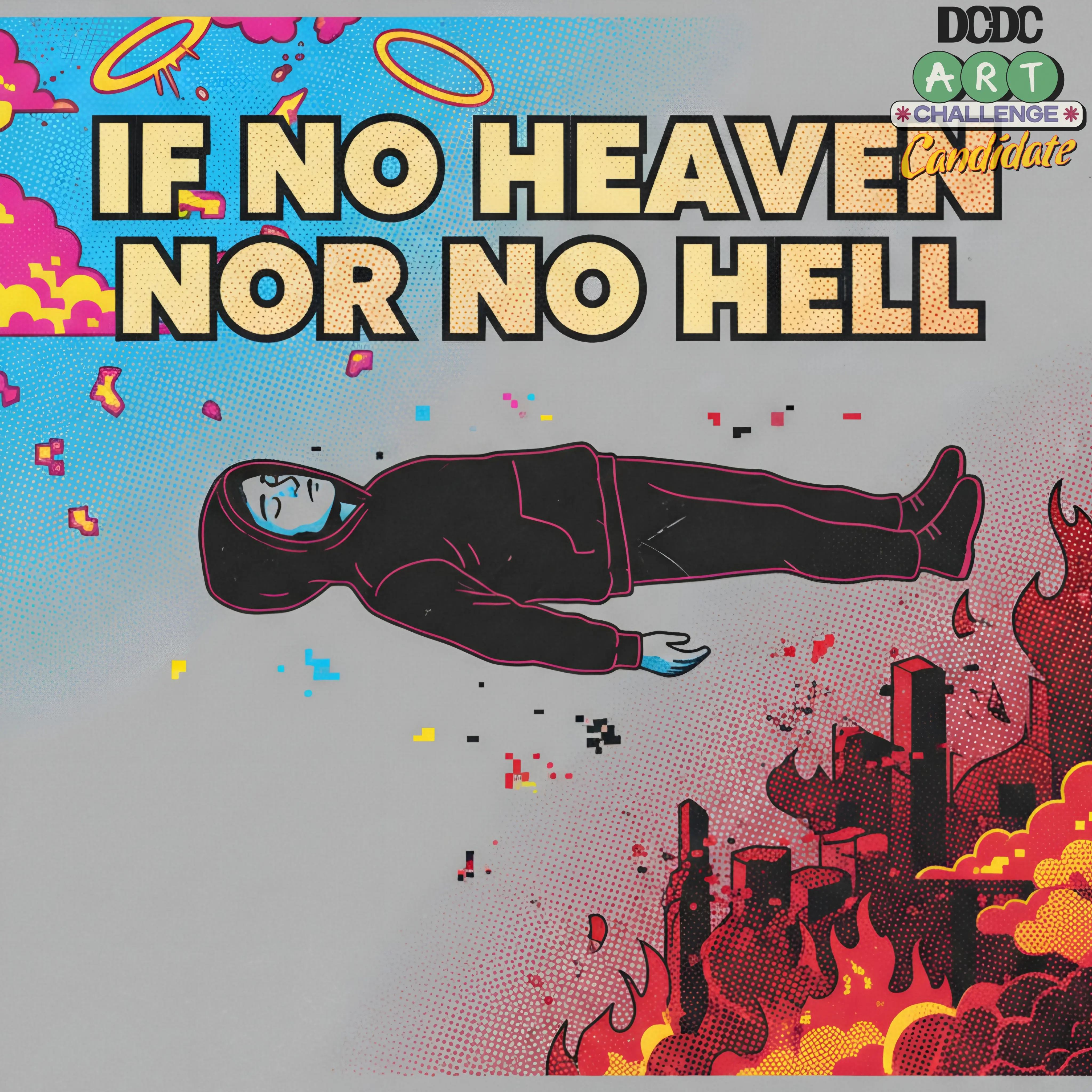 Sebuah karya pop art yang menggambarkan ambiguitas eksistensi — dunia tanpa surga maupun neraka. Warna-warna kontras antara biru neon dan merah darah berpadu dalam kehampaan abu-abu, menciptakan dialog visual antara dosa dan kebebasan. Sosok manusia berhoodie hitam berdiri di tengah ruang hampa, memantulkan bayangan dirinya yang tak lagi tahu ke mana harus pulang. Gaya komik retro dengan tekstur halftone dan pencahayaan lembut memberi nuansa melankolis-modern yang memadukan realisme batin dan absurditas visual.
