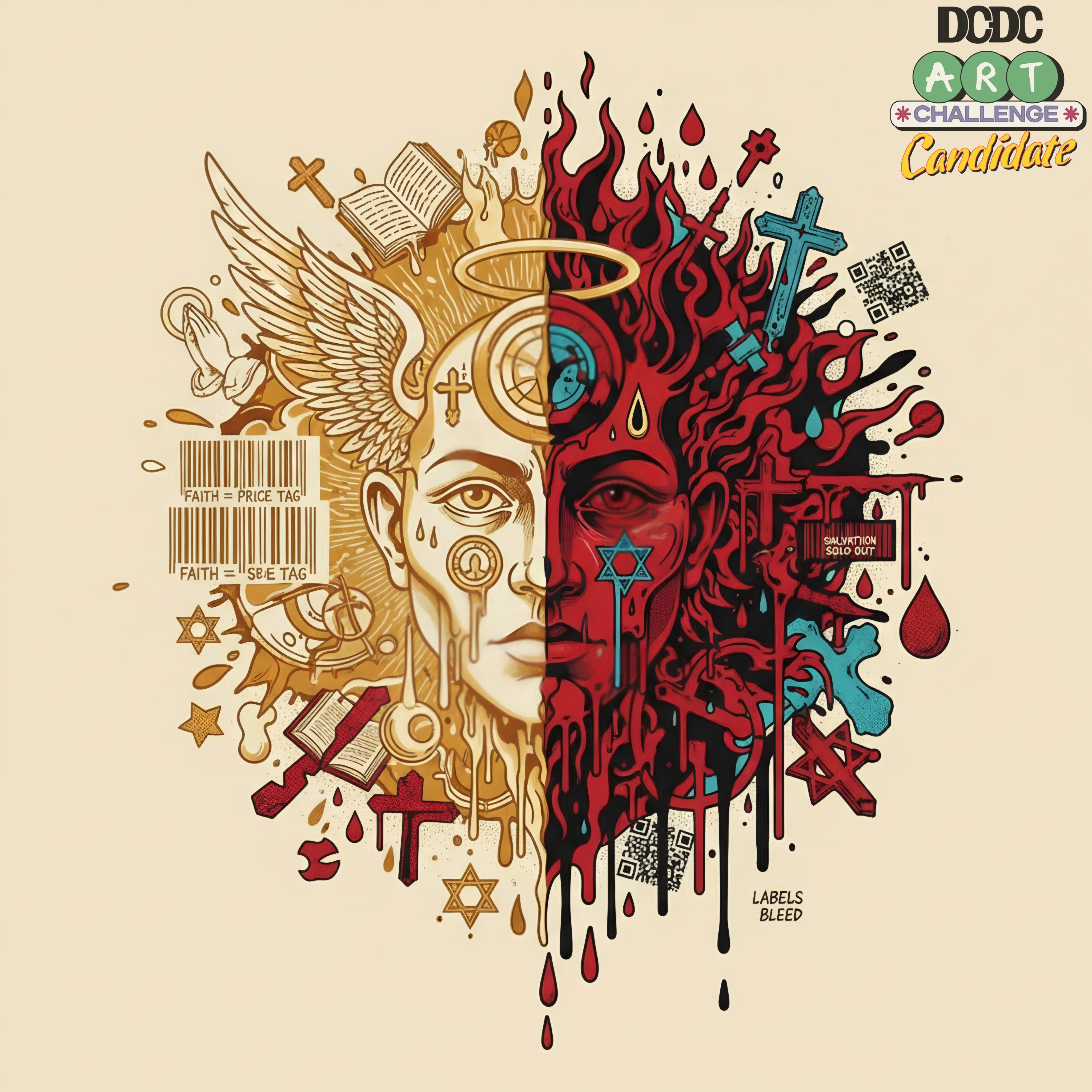 Karya ini adalah eksplorasi dualitas dan kritik sosial yang kuat. Wajah yang terbelah menunjukkan perjuangan antara spiritualitas yang dikomodifikasi (Labels) dan realitas penderitaan manusia (Bloods). Dengan gaya Pop Art yang berani (garis tebal, warna kontras, penggunaan simbol populer), karya ini mengomentari bagaimana iman, label identitas, dan budaya konsumen modern berbenturan dan terkadang saling mencemari.