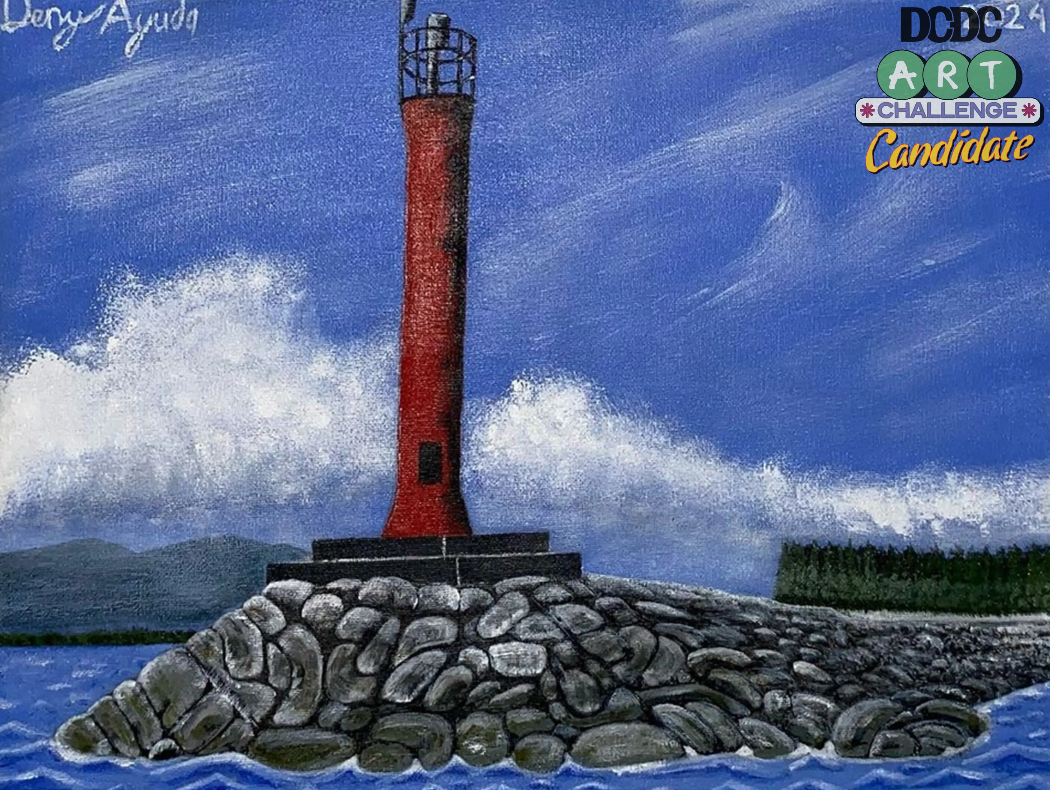 Lukisan ini Secara simbolis, Mercusuar sering diartikan sebagai simbol harapan, petunjuk, dan keselamatan. Dalam konteks lukisan ini, mercusuar mungkin melambangkan sebuah penanda atau tujuan yang dapat memberi kita arah dalam hidup. Batu karang yang kokoh bisa diartikan sebagai kekuatan dan ketahanan, Sementara laut yang bergelombang bisa merepresentasikan tantangan atau perubahan yang harus kita hadapi. cat akrilik diatas kanvas, 30 x 40 cm.