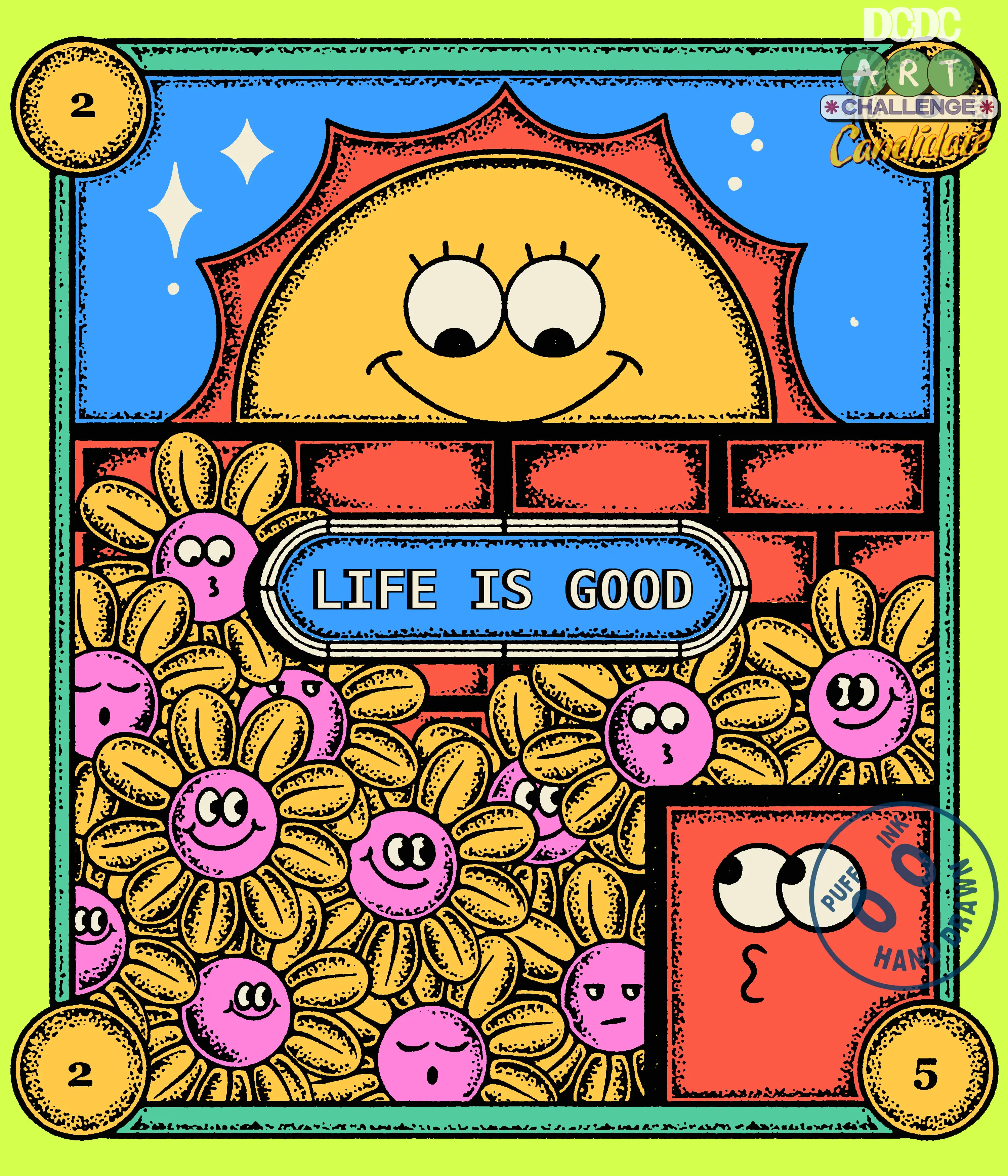 Ilustrasi bergaya retro psikedelik dengan warna cerah dan tekstur grain khas era 70-an. Gambar menampilkan matahari tersenyum di balik dinding bata dengan tulisan “LIFE IS GOOD” di tengah, disertai bunga-bunga menampilkan ekspresif yang memberi kesan positif, hangat, dan penuh kehidupan. Desain ini memancarkan nuansa optimis dan ceria dengan sentuhan vintage buatan tangan.