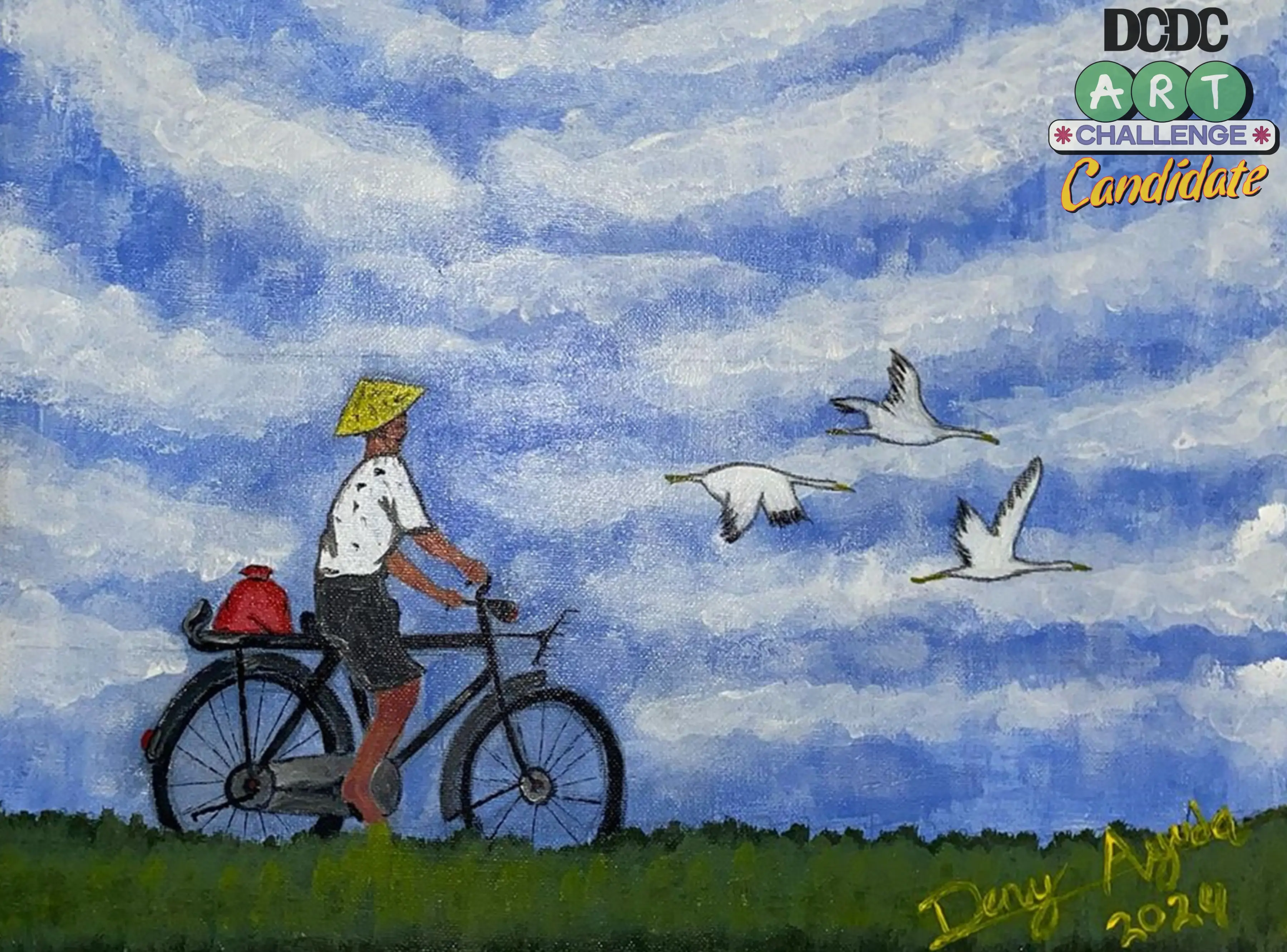 Lukisan ini memberikan kesan pemandangan yang damai dan menenangkan. Sosok pria yang bersepeda di jalan setapak, dikelilingi oleh langit biru dan burung-burung yang terbang bebas, menciptakan suasana yang ringan dan menyenangkan. Gaya lukisan yang sederhana dan ekspresif berhasil menangkap momen keindahan alam dan kebebasan. cat akrilik diatas kanvas, 30 x 40 cm.