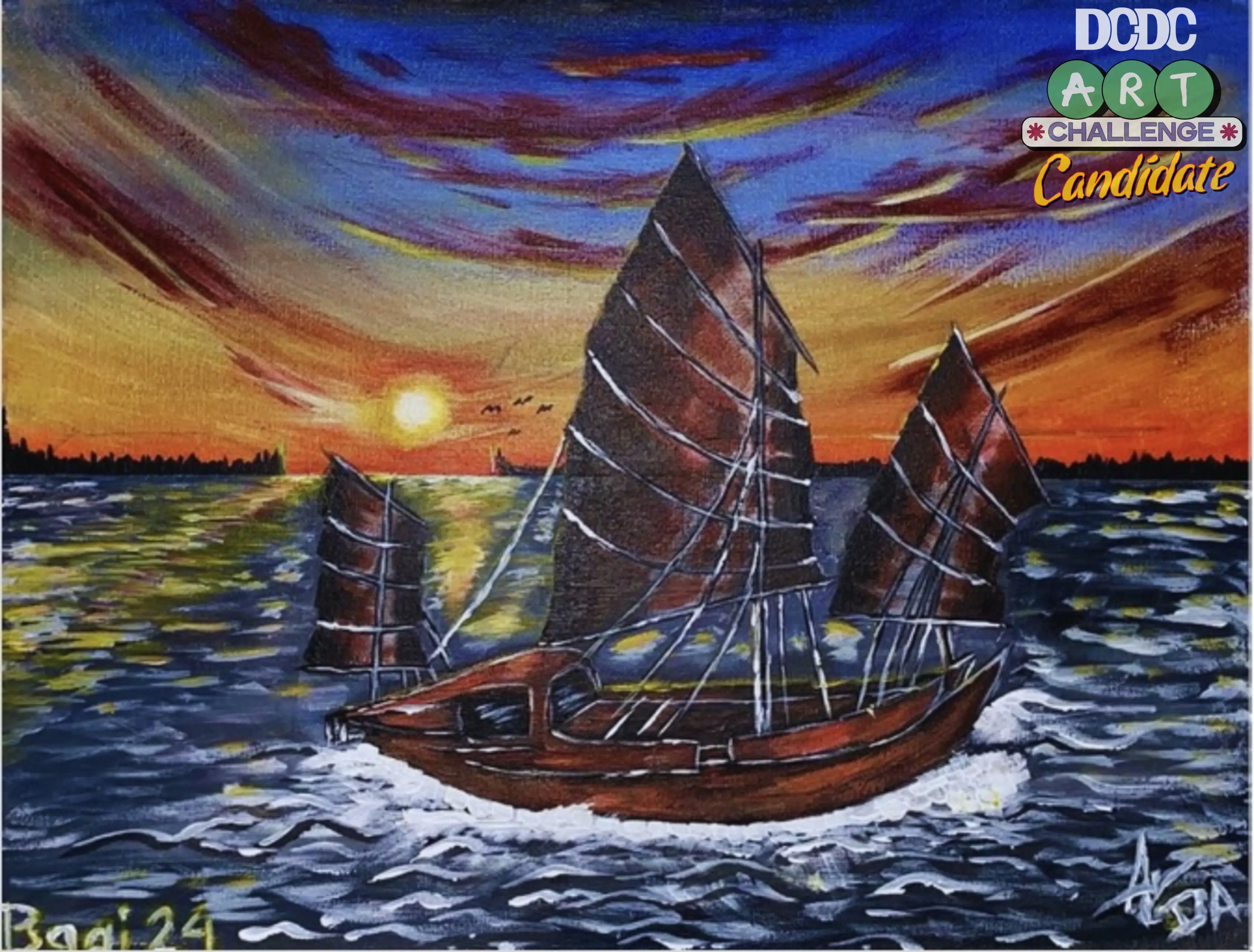 Lukisan ini memancarkan suasana kedamaian dan keindahan alam. Kapal berlayar mengarungi ombak mengreprestasikan kebebasan dan perubahan yang harus siap kita hadapi dalam perjalanan hidup penuh dengan ketidakpastian. cat akrilik diatas kanvas, 30 x 40 cm.