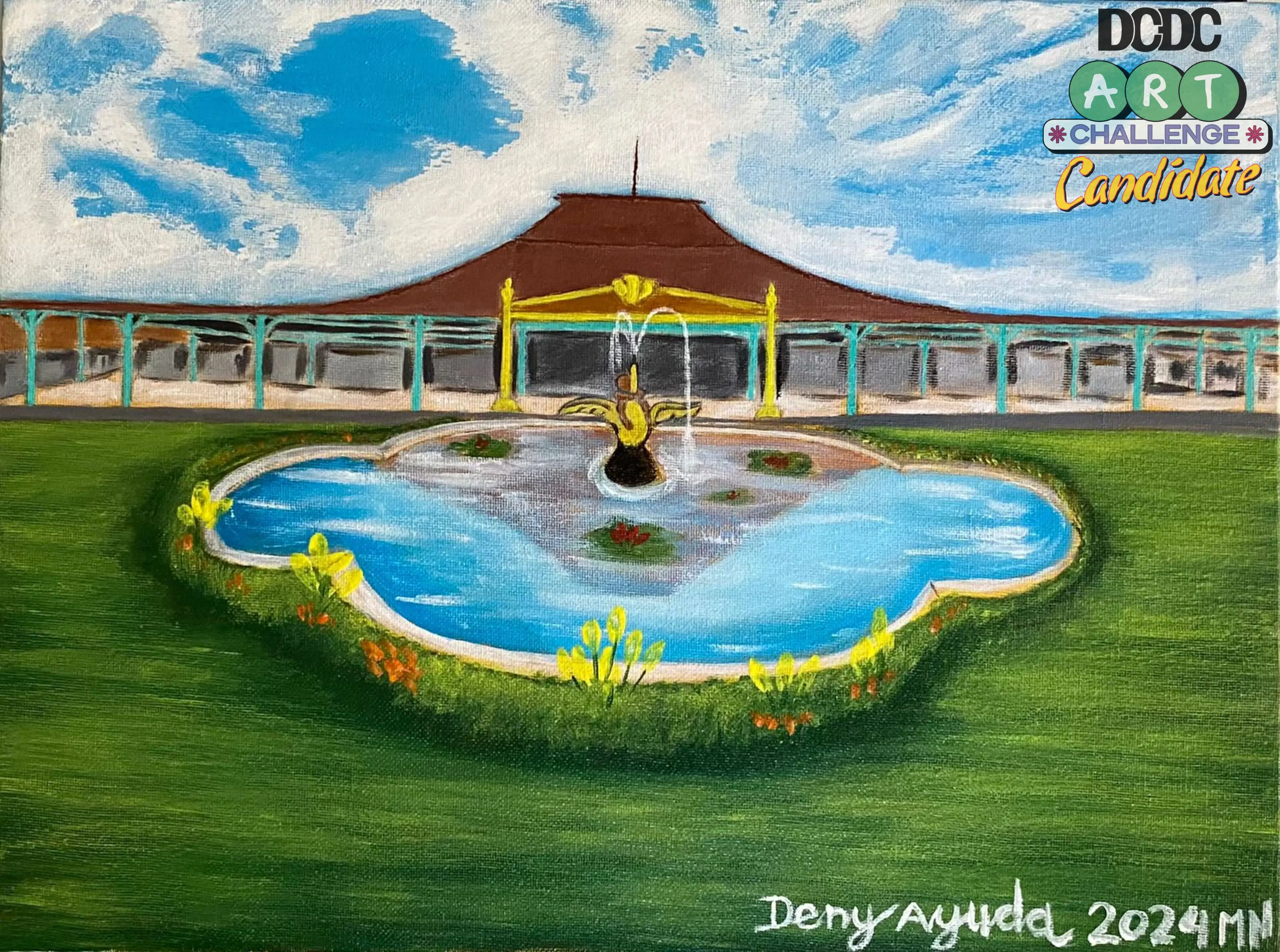 Lukisan ini memberikan kesan pemandangan yang tenang dan damai. Bangunan tradisional Jawa yang megah, dipadukan dengan kolam air mancur yang indah dan taman yang asri, menciptakan suasana yang menenangkan dan menyenangkan. cat akrilik diatas kanvas, 30 x 40 cm.