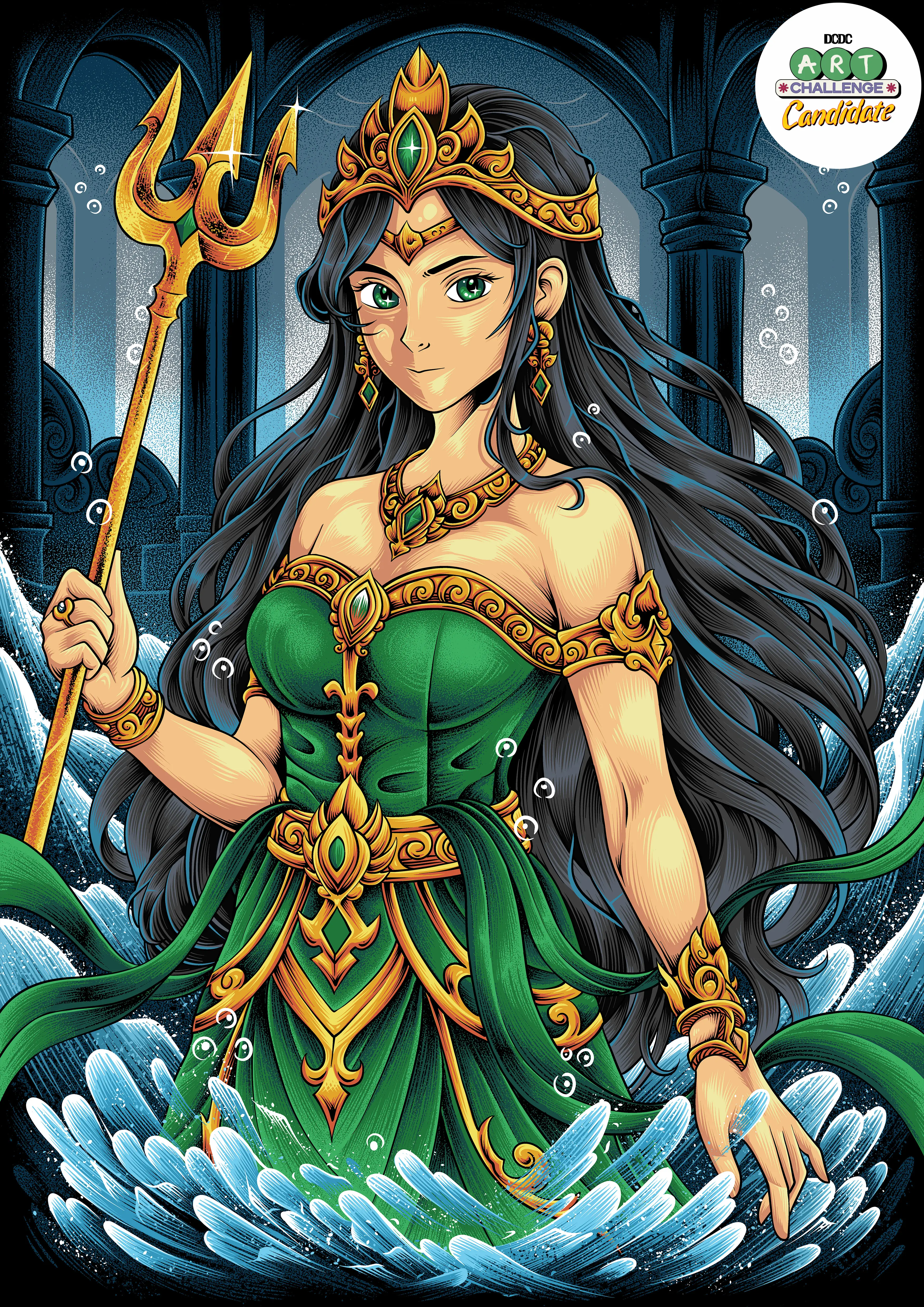 Busana hijau yang dipadukan dengan ornamen emas menegaskan wibawa dan kekuatan spiritual sang ratu. Di tangannya, ia memegang trisula emas—simbol kekuasaan dan kendali atas ombak serta kehidupan laut. Latar belakang berupa arsitektur megah bawah laut dan gelombang yang berputar menambah kesan magis, seakan memperlihatkan bahwa ia adalah penjaga sekaligus penguasa kerajaan lautan.