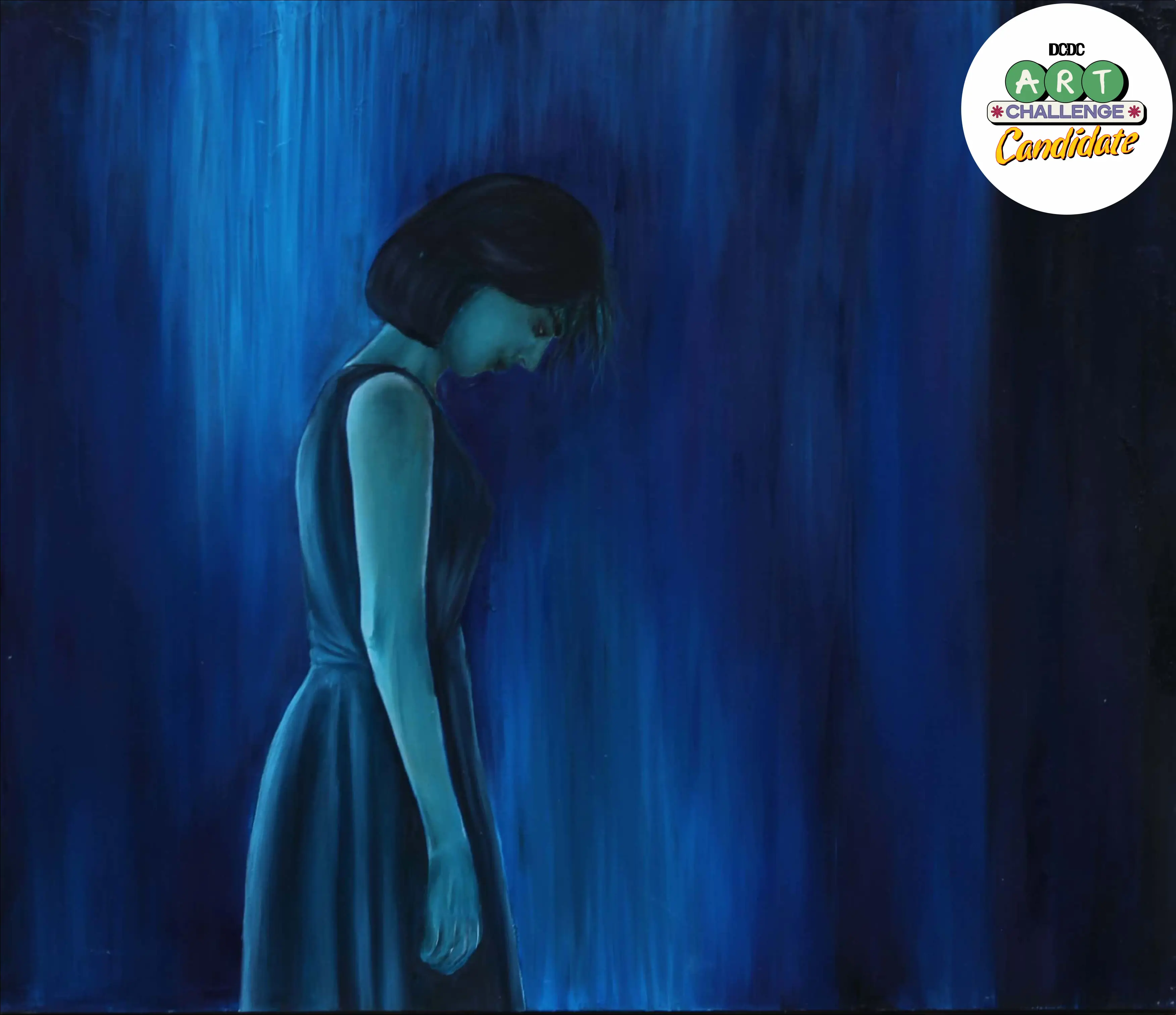 Melalui figur perempuan yang tertunduk dalam dominasi warna biru, saya ingin menggambarkan suasana introspektif yang melankolis, namun tetap menyimpan cahaya lembut sebagai simbol harapan dan penerimaan. Warna biru saya pilih karena mampu memantulkan kedalaman emosi: antara ketenangan dan kesedihan, antara jarak dan kedekatan.