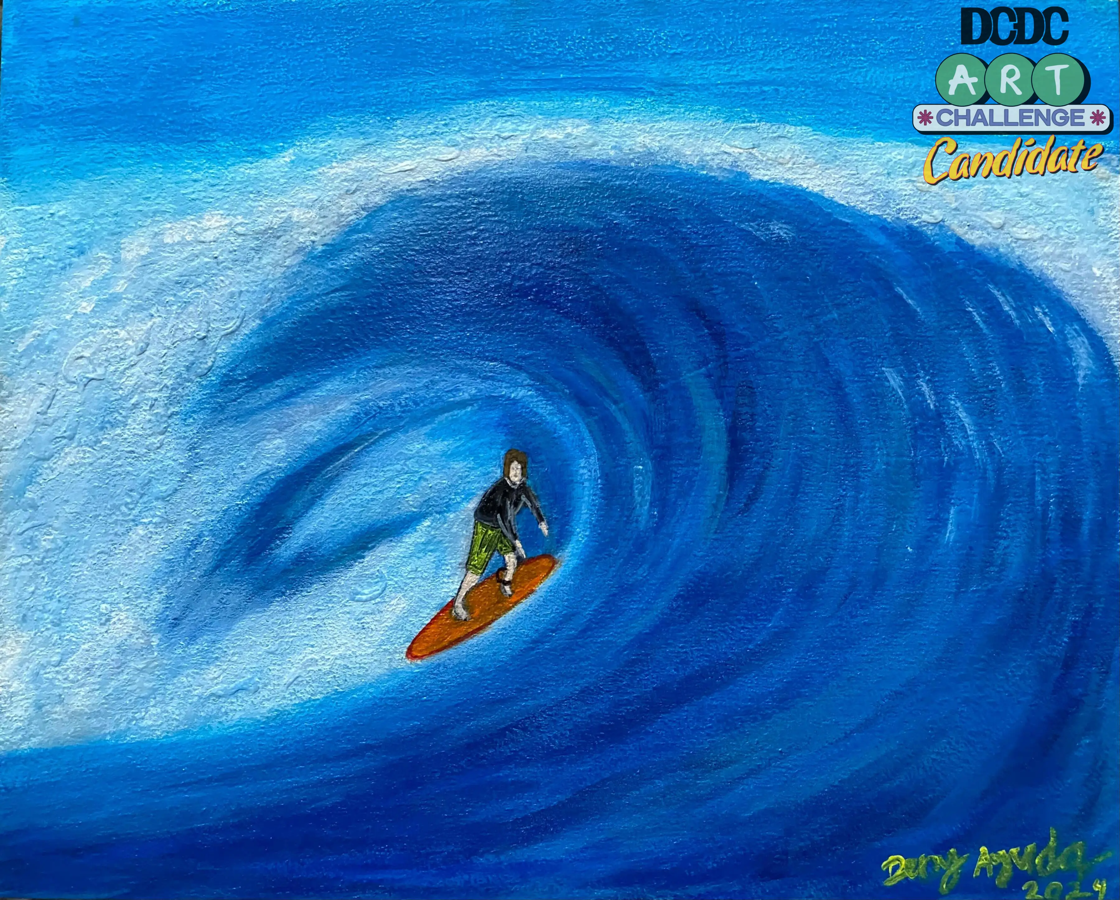Lukisan ini menampilkan Laut yang bergelombang - sosok peselancar bisa merepresentasikan tantangan atau perubahan yang harus kita hadapi. cat akrilik diatas kanvas, 40 x 50 cm.