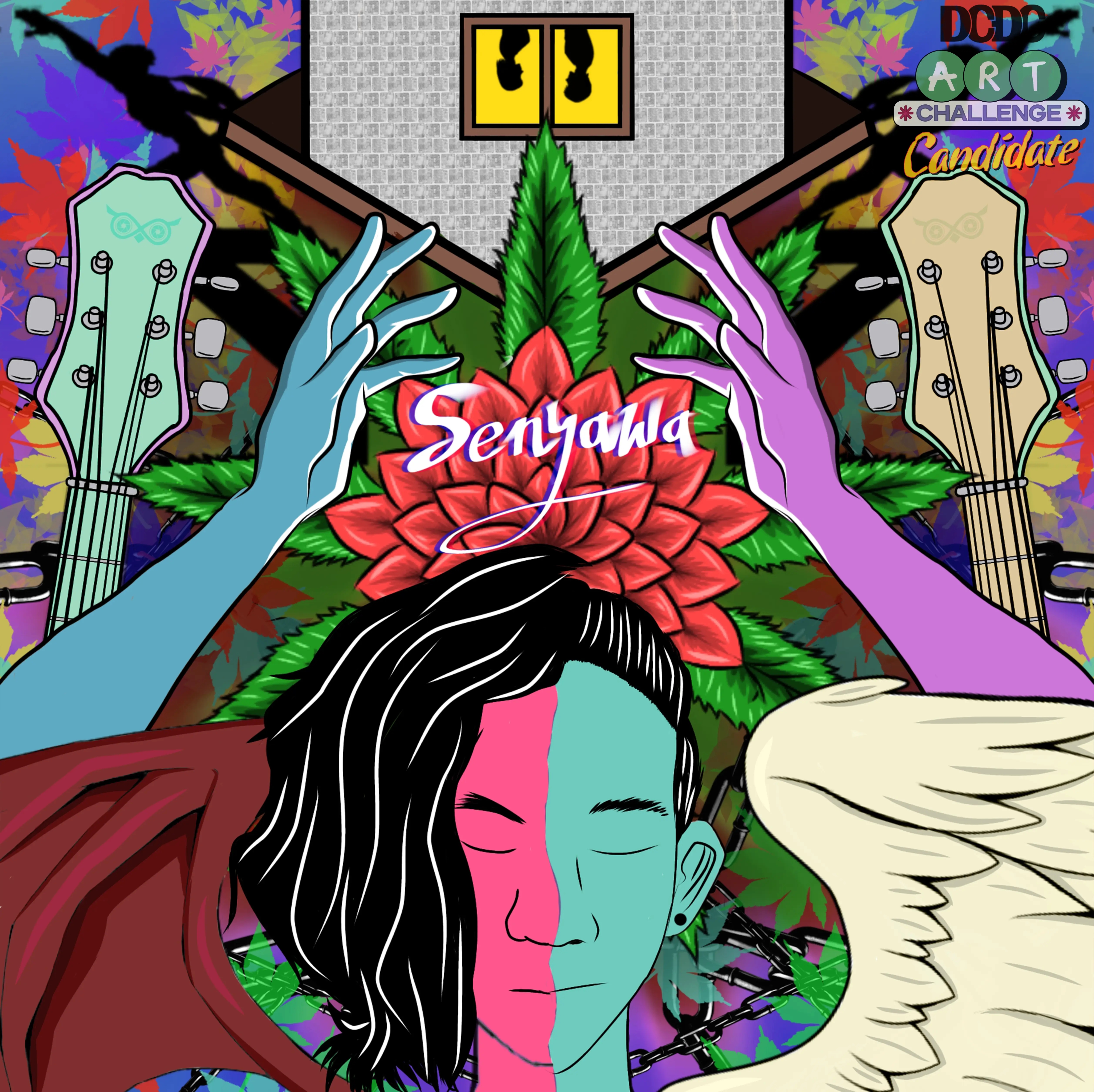 Above the figure, a large, stylized red lotus flower with green cannabis-like leaves acts as a central motif. Two disembodied hands, one light blue and one purple, frame the flower, meeting beneath a stylized, windowed house and two guitars that serve as side pillars. The entire scene is set against a brightly colored, chaotic background of overlapping maple leaves and silhouetted figures, blending psychedelic and pop art styles to capture the band's complex narrative.