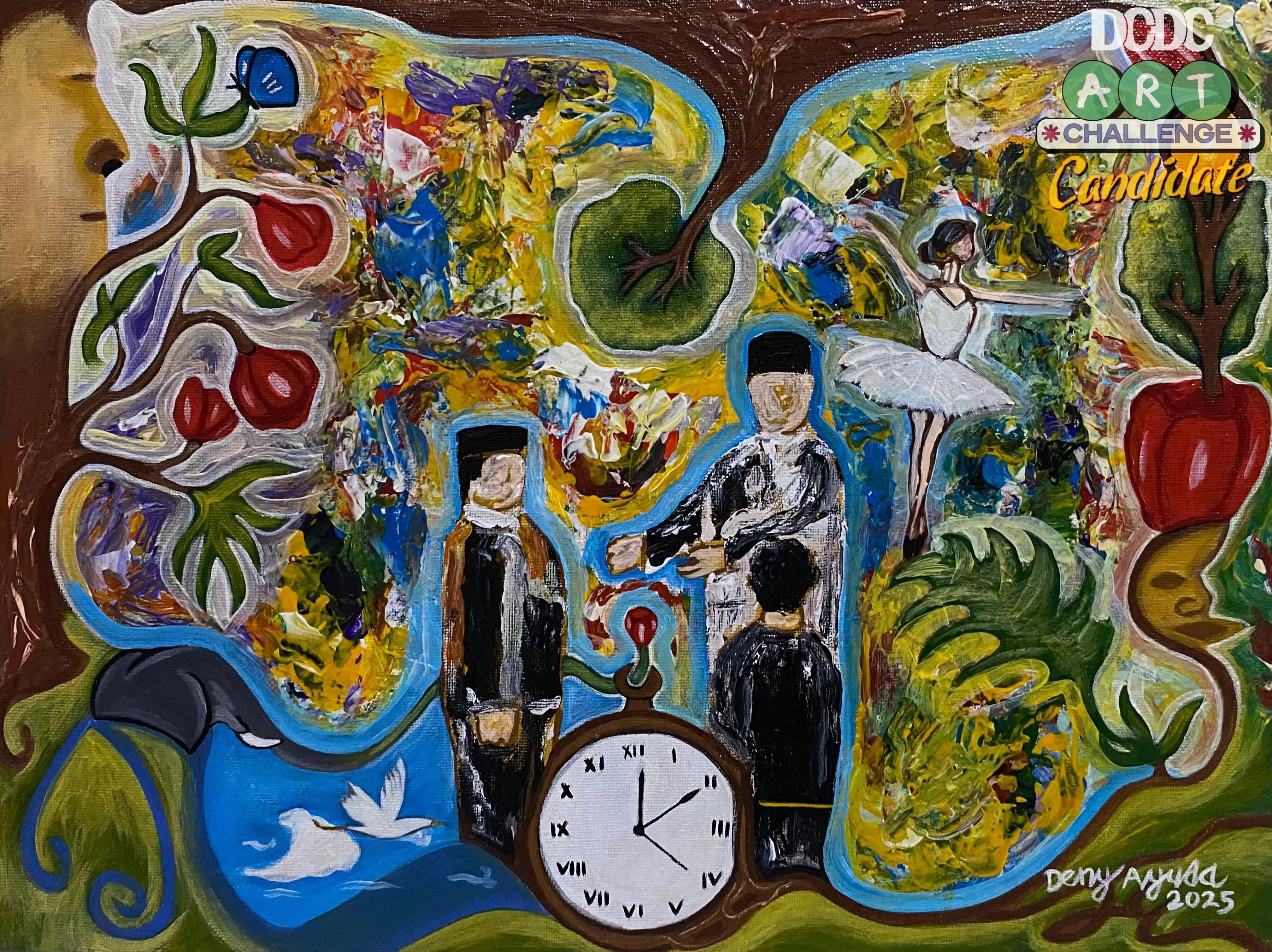 Karya seni dalam gambar yang Anda berikan adalah lukisan berwarna-warni dan berlapis yang tampaknya merupakan campuran dari gaya surealisme dan ekspresionisme dengan sentuhan naif atau primitif dalam penggambaran figur manusianya. cat akrilik diatas kanvas, 30 x 40 cm.