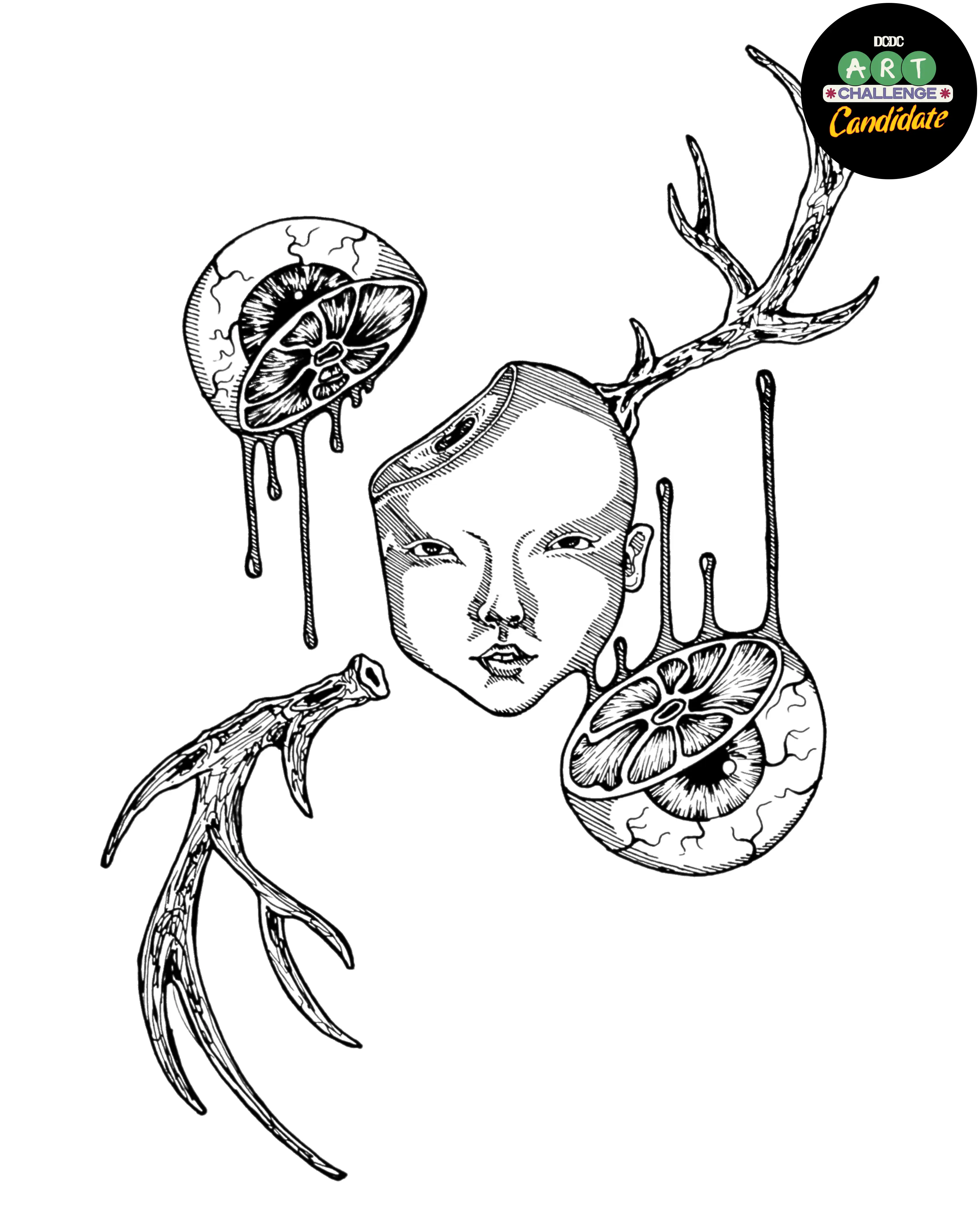 Karya ini menampilkan sebuah kepala manusia dengan tanduk menjulang, mata yang meleleh seperti buah sitrus yang terbelah, dan potongan organik yang menggantung dalam ruang hampa. Judul “The Citrus of Dying Eyes” sendiri adalah paradoks yang menyatukan dua hal yang tampak berlawanan: kesegaran buah dengan kefanaan pandangan manusia.