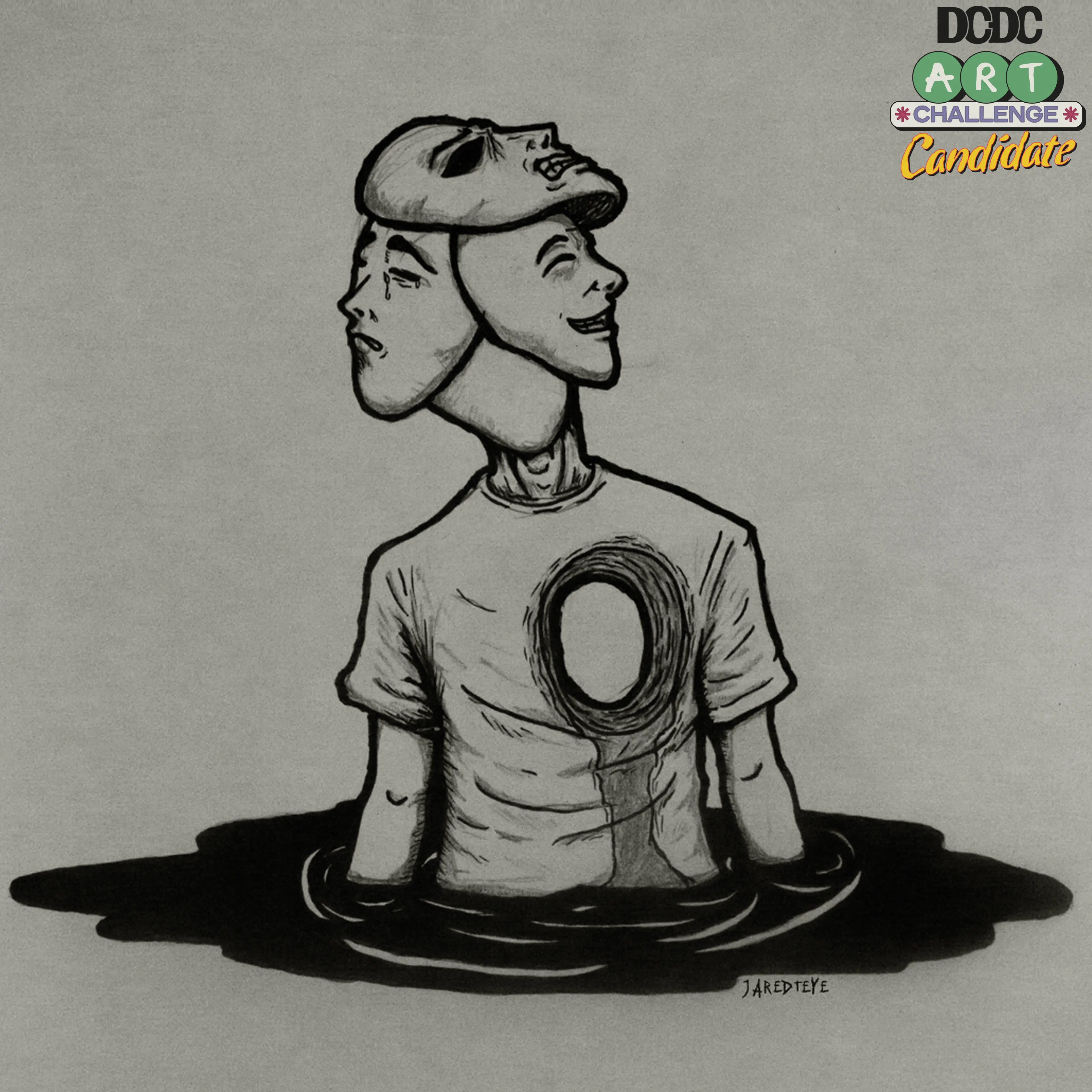 A deep dive into the vacant space within. The duality of the faces—one in pain, the other a forced, unsettling smile—perfectly captures the mask we wear to hide the profound emptiness inside. It's the struggle to appear whole when you're hollowed out. Drowning in the darkness of an unfillable void.