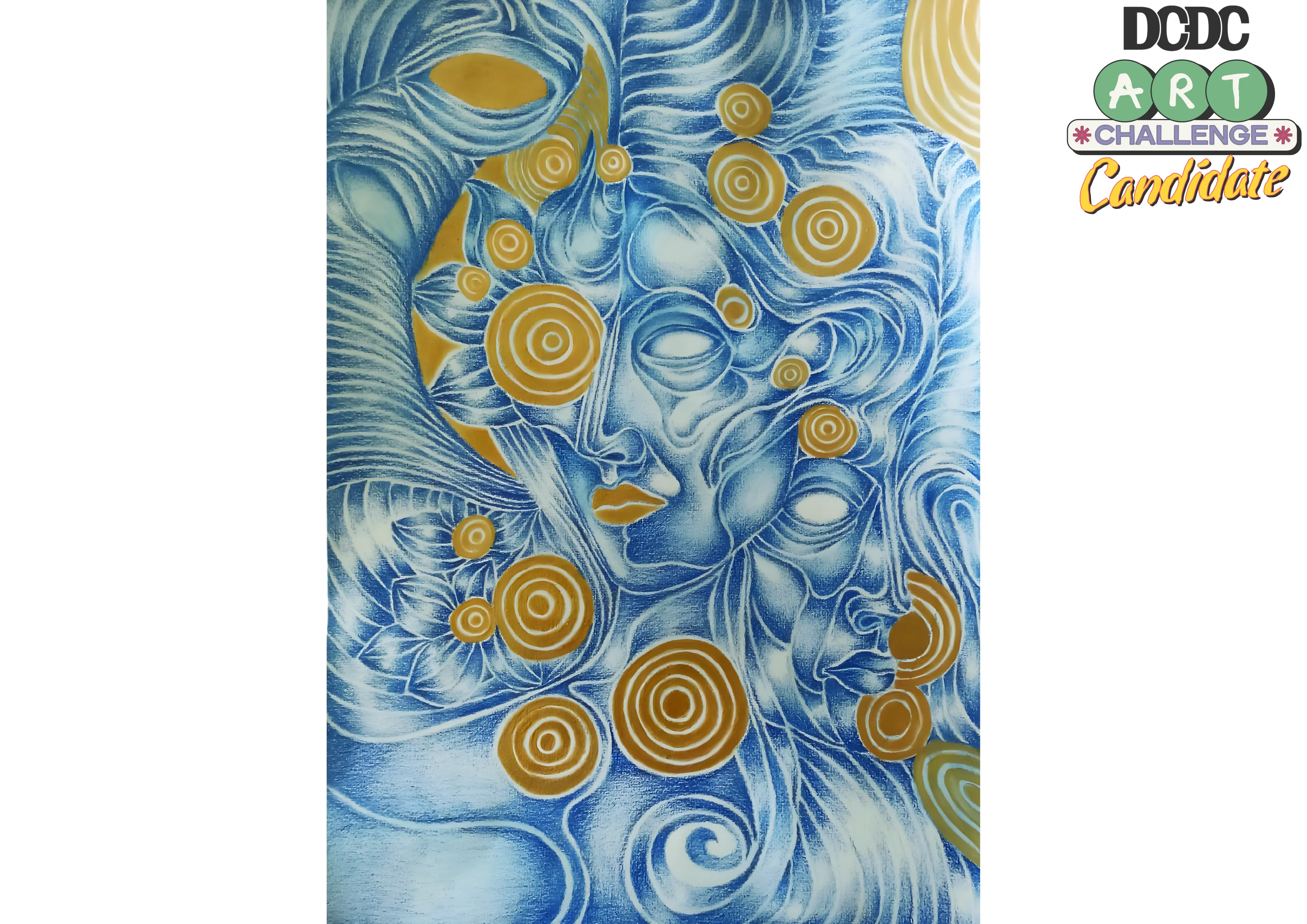 Karya ini adalah perjalanan batin yang menetes dari kesadaran menuju kertas, terwujud melalui pensil biru dan sapuan emas akrilik—dua warna yang berkelindan antara dingin dan hangat, antara pikiran dan intuisi, antara tubuh dan jiwa. Di hadapan kita, figur perempuan muncul tidak sebagai potret, melainkan sebagai gema psikis yang mewujud dari ruang bawah sadar. Wajahnya hening, namun matanya kosong—tanpa bola mata, tanpa pusat pandang. Kekosongan itu bukan kehilangan, melainkan ruang tafsir, cermin yang tak lagi memantulkan dunia, melainkan menyerapnya. Ia adalah “subjek dalam cermin” sebagaimana dikatakan Lacan: diri yang mencari dirinya di balik bayangan, dan justru menemukan kehampaan yang paling manusiawi.